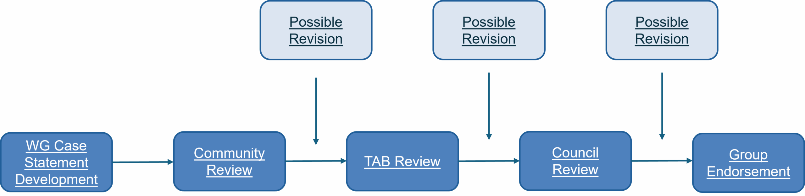 - Requiring revisions: TAB will notify the group chairs of the required changes. Once made, TAB will review and approve the revised SoW and forwarded on to Council for final review.